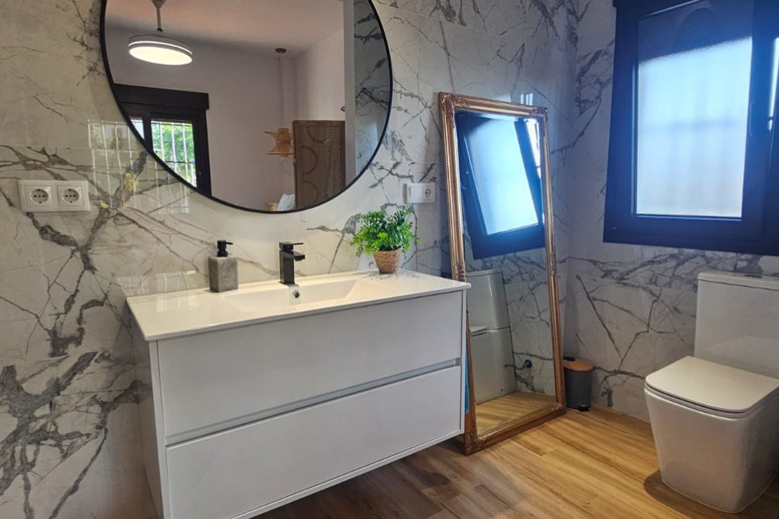 En la planta baja hay un salón amplio y luminoso, conectado con un porche exterior gracias a grandes ventanas. También cuenta con un dormitorio con armario empotrado y un baño completo, ideal para visitas o para quienes prefieren evitar subir escaleras. La cocina, completamente equipada, reúne funcionalidad y comodidad para el día a día.