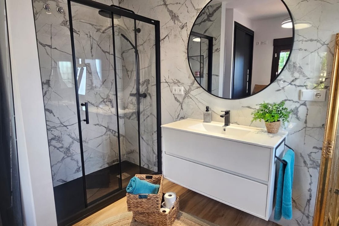 En la primera planta se encuentran tres dormitorios: el dormitorio principal con baño en suite y vestidor, y otros dos dormitorios que comparten un baño completo. La planta superior también tiene una terraza privada desde donde se pueden contemplar vistas al campo de golf y a los alrededores.