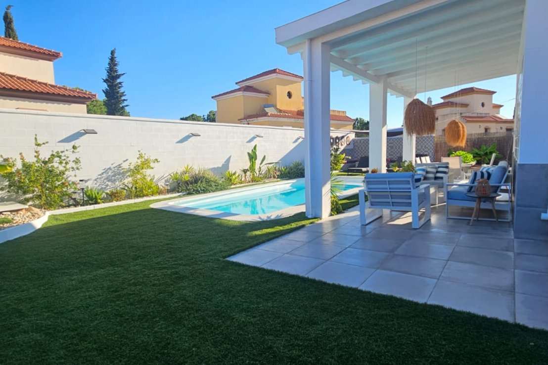 Esta villa independiente se encuentra en la urbanización Costa Esuri, junto al campo de golf Guadiana Links y muy cerca de la frontera con Portugal. Su parcela de 600 m² está perfectamente aprovechada, con zonas verdes, piscina privada y espacios para disfrutar al aire libre.